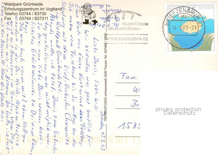 73754967 alte Postkarte Gruenheide Vogtland Waldpark Fliegeraufnahme postalisch gelaufen Erhaltung siehe scans [FriedD77] KatCode: 11110014178030