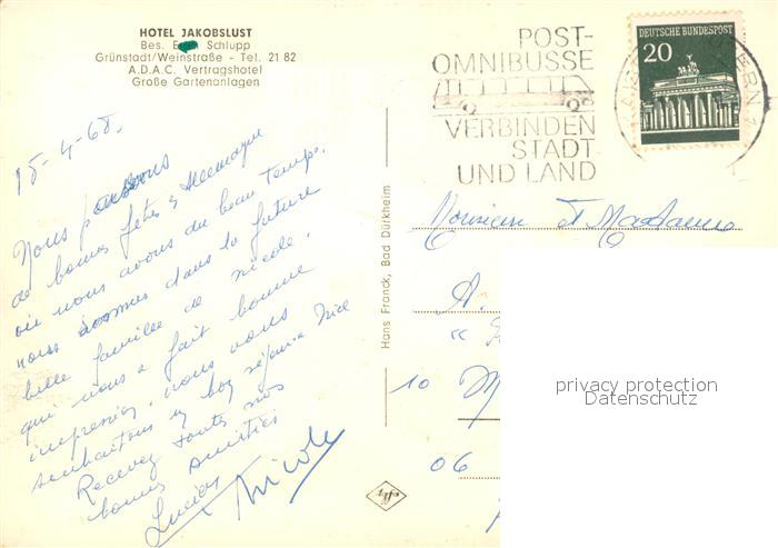 73682092 alte Postkarte Gruenstadt Hotel Jakobslust Restaurant postalisch gelaufen Erhaltung siehe scans [FriedD77] KatCode: 11110007332024