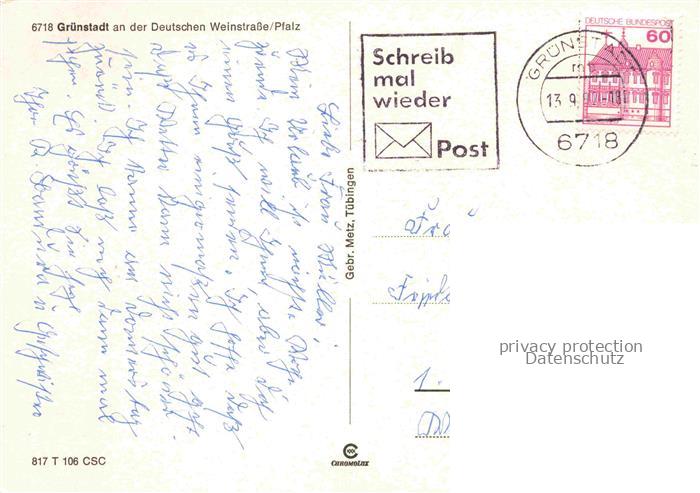 74042665 alte Postkarte Gruenstadt Rheinland-Pfalz Teilansichten Park Denkmal postalisch gelaufen Erhaltung siehe scans [FriedD77] KatCode: 11110007332024