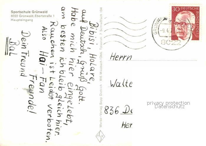 72784740 alte Postkarte Gruenwald Muenchen Sportschule postalisch gelaufen Erhaltung siehe scans [LiesaD40] KatCode: 11110009184122