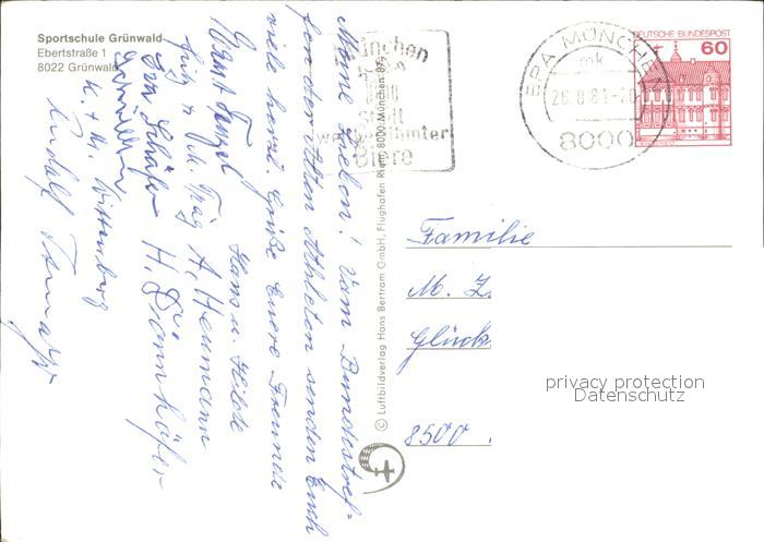 72022295 alte Postkarte Gruenwald Muenchen Sportschule Gruenwald Fliegeraufnahme postalisch gelaufen Erhaltung siehe scans KatCode: 11110009184122