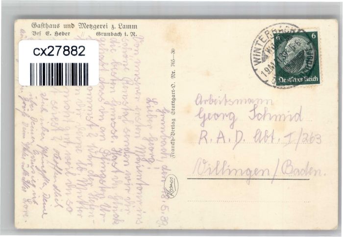 30908593 alte Postkarte Grunbach Remshalden Gasthaus Metzgerei Lamm postalisch gelaufen KatCode: 11110008119090
