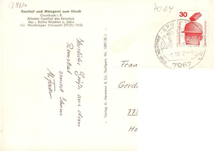 73917192 alte Postkarte Grunbach Remshalden Gasthof Metzgerei zum Hirsch postalisch gelaufen Erhaltung siehe scans [WerneD78] KatCode: 11110008119090