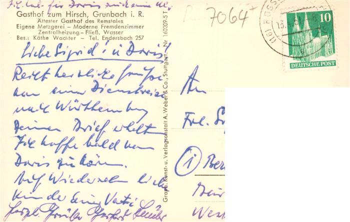 73900150 alte Postkarte Grunbach Remshalden Gasthof zum Hirsch Fachwerkhaus postalisch gelaufen Erhaltung siehe scans [FriedD77] KatCode: 11110008119090