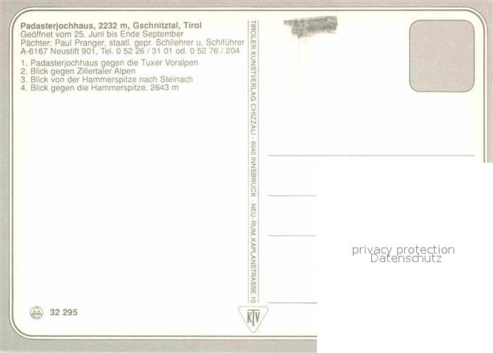 72750613 Gschnitz Tirol Padasterjochhaus im Gschnitztal postalisch nicht gelaufen Erhaltung siehe scans [LiesaD40] KatCode: 11390332070317