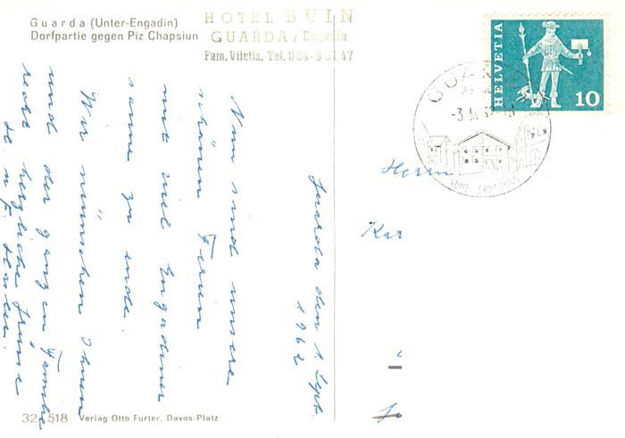 13919813 alte Postkarte Guarda GR Dorfpartie mit Piz Chasiun postalisch gelaufen Erhaltung siehe scans [WerneD78] KatCode: 11470100325140