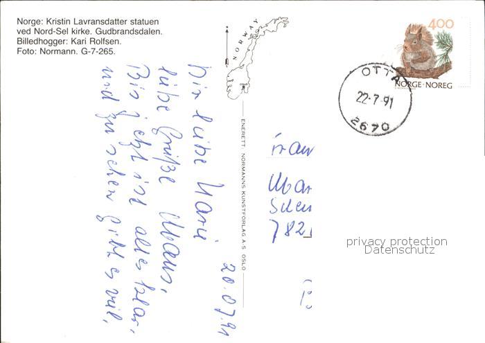 old postcard Gudbrandsdalen Kristin Lavransdatter statuen Nord-Sel kirke postalisch gelaufen Erhaltung siehe scans