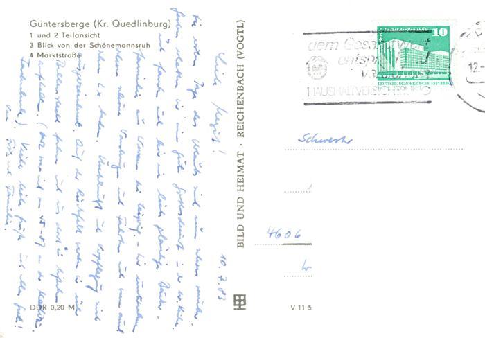 73895777 alte Postkarte Guentersberge Teilansichten Blick von der Schoenemannsruh Marktstrasse postalisch gelaufen Erhaltung siehe scans [FriedD77] KatCode: 11110015085130