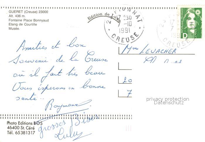 13230047 carte postale Gueret Fontaine Place Bonnyaud Etang de Courtille Musee postalisch gelaufen Erhaltung siehe scans [KathaD81] KatCode: 11170023223096