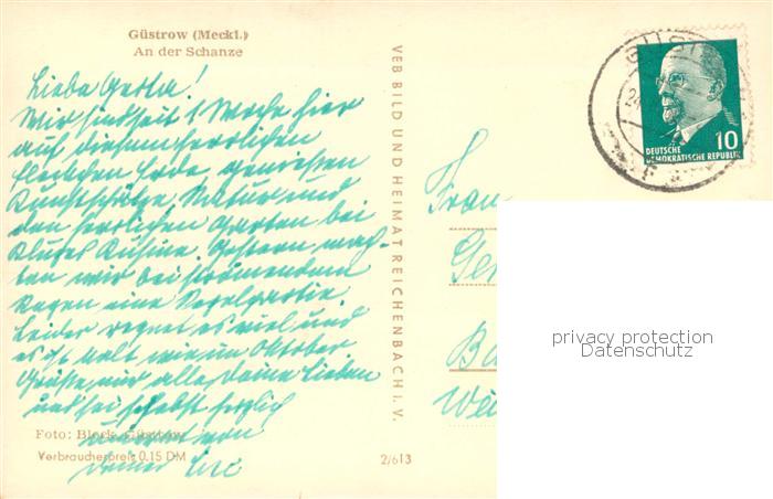 73776408 alte Postkarte Guestrow Mecklenburg Vorpommern An der Schanze Blick zur Kirche postalisch gelaufen Erhaltung siehe scans [FriedD77] KatCode: 11110013053031