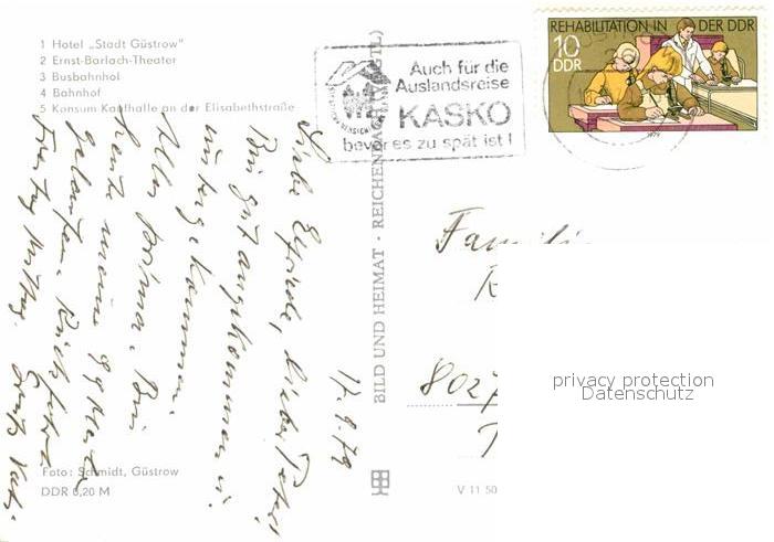 72643466 alte Postkarte Guestrow Mecklenburg Vorpommern Hotel Stadt Guestrow Ernst Barlach Theater Busbahnhof Bahnhof Konsum Kaufhalle postalisch gelaufen Erhaltung siehe scans [WerneD78] KatCode: 11110013053031