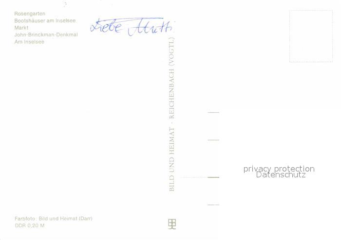 72627762 Guestrow Mecklenburg Vorpommern Rosengarten Bootshaeuser am Inselsee Markt John Brinckmann Denkmal Liegewiese postalisch nicht gelaufen Erhaltung siehe scans [WerneD78] KatCode: 11110013053031