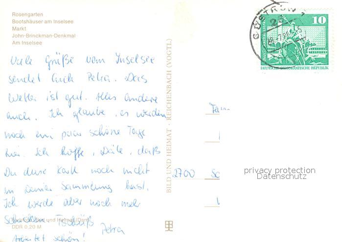 73655272 alte Postkarte Guestrow Mecklenburg Vorpommern Rosengarten Bootshaeuser am Inselsee Markt John Brinkmann Denkmal Badestrand postalisch gelaufen Erhaltung siehe scans [FriedD77] KatCode: 11110013053031