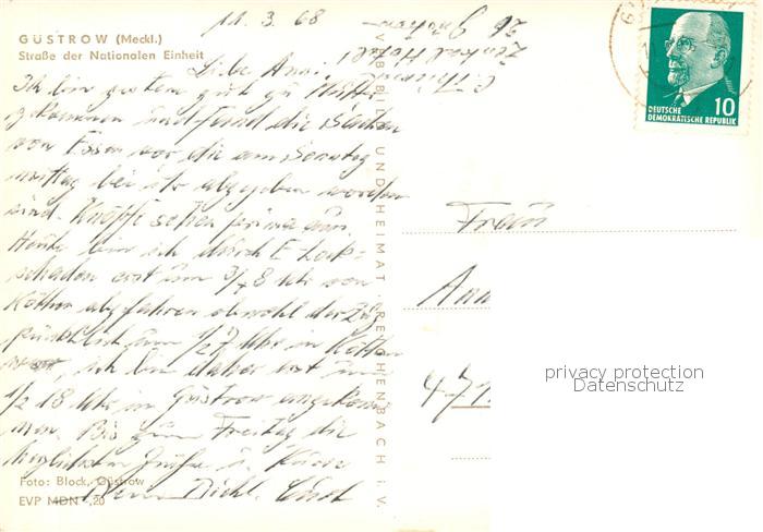 73865395 alte Postkarte Guestrow Mecklenburg Vorpommern Strasse der Nationalen Einheit postalisch gelaufen Erhaltung siehe scans [WerneD78] KatCode: 11110013053031