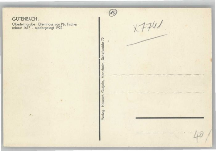 40731562 Guetenbach Schwarzwald Furtwangen BW berleimgrube Elternhaus Pfarrer Fischer postalisch nicht gelaufen Alte Ansichtskarte Postkarte Katcode 11110008326020