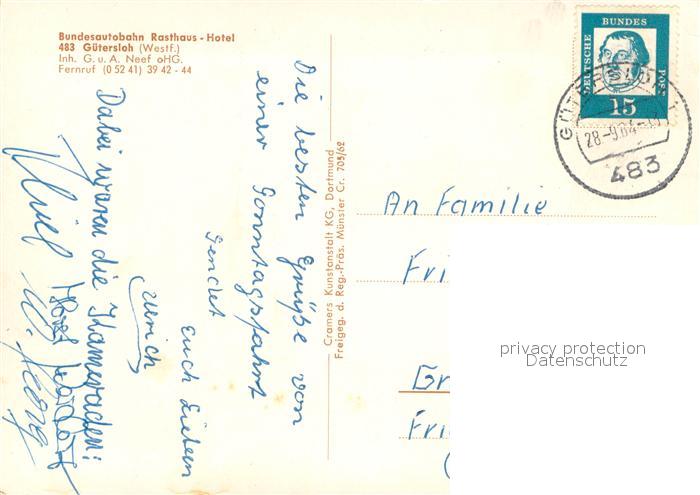 73740492 alte Postkarte Guetersloh BAB Rasthaus Hotel Fliegeraufnahme postalisch gelaufen Erhaltung siehe scans [WerneD78] KatCode: 11110005754008