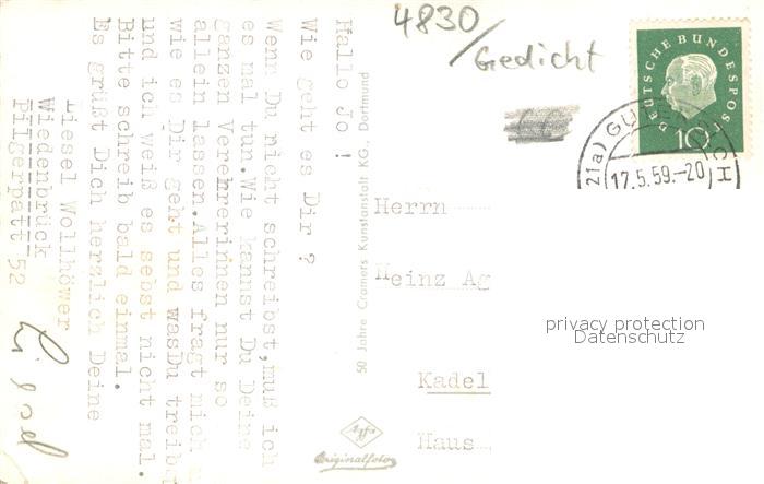73695553 alte Postkarte Guetersloh Gedicht Botanischer Garten Rathaus Freilichtbuehne Meiers Muehle Apostelkirche postalisch gelaufen Erhaltung siehe scans [LiesaD40] KatCode: 11110005754008
