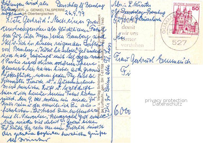 72849768 alte Postkarte Gummersbach Agger- Genkeltalsperre Fliegeraufnahme postalisch gelaufen Erhaltung siehe scans [NatalD47] KatCode: 11110005374012