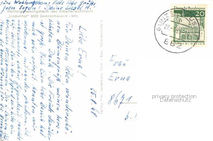72822591 alte Postkarte Gunzenhausen Altmuehlsee Muettergenesungsheim der Arbeiterwohlfahrt Lindenhof postalisch gelaufen Erhaltung siehe scans [FriedD77] KatCode: 11110009577136