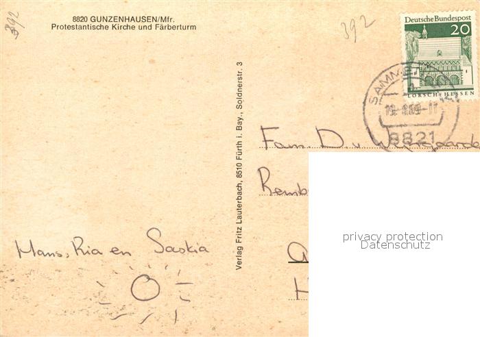 73306652 alte Postkarte Gunzenhausen Altmuehlsee Prot Kirche und Faerberturm postalisch gelaufen Erhaltung siehe scans [WerneD78] KatCode: 11110009577136