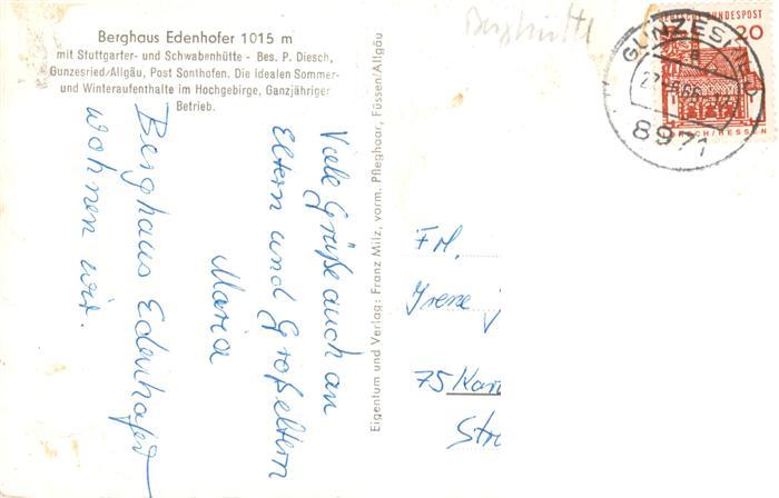 73931453 alte Postkarte Gunzesried Blaichach Bayern Berghaus Edenhofer mit Stuttgarterhuette und Schwabenhuette Bayerische Alpen postalisch gelaufen Erhaltung siehe scans [FriedD77] KatCode: 11110009780115