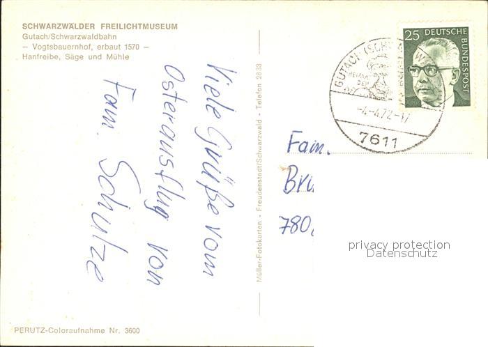 71830711 alte Postkarte Gutachtal Schwarzwaldbahn Schwarzwaelder Freilichtmuseum Vogtsbauernhof Hanfreibe Saege Muehle postalisch gelaufen Erhaltung siehe scans KatCode: 11110008317039
