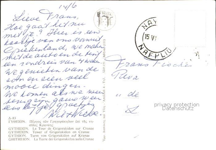 old postcard Gythion Turm von Grigorakidon postalisch gelaufen Erhaltung siehe scans