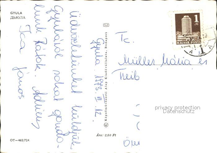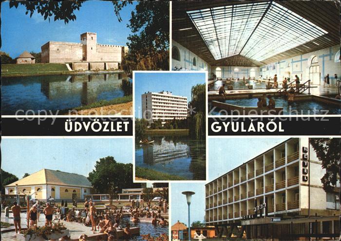 old postcard Gyula Schloss Hallen und Freibad Hotel postalisch gelaufen Erhaltung siehe scans