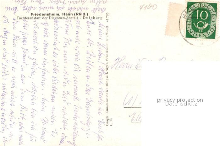 43345913 alte Postkarte Haan Rheinland Friedensheim Durchblick vom Eingang Diakonenanstalt postalisch gelaufen Erhaltung siehe scans [WerneD78] KatCode: 11110005158008