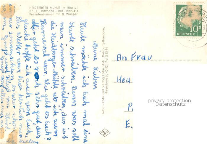 73746420 alte Postkarte Haan Rheinland Heidberger Muehle im Ittertal postalisch gelaufen Erhaltung siehe scans [WerneD78] KatCode: 11110005158008