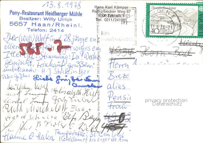 71845306 alte Postkarte Haan Rheinland Heidberger Muehle Pony-Restaurant postalisch gelaufen Erhaltung siehe scans KatCode: 11110005158008