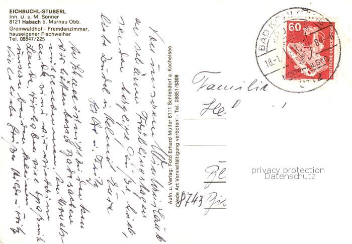 73866568 alte Postkarte Habach Oberbayern Eichbichlstueberl Gastraeume Panorama Kirche Gondelteich postalisch gelaufen Erhaltung siehe scans [WerneD78] KatCode: 11110009190126