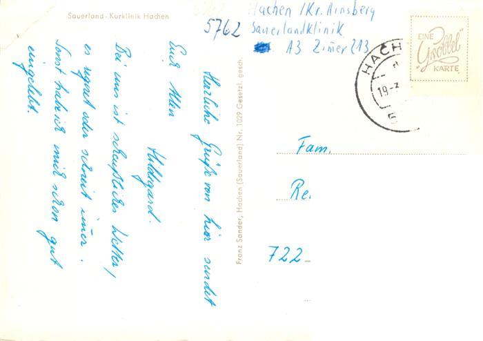73943290 alte Postkarte Hachen Sauerland Arnsberg Sauerland Kurklinik postalisch gelaufen Erhaltung siehe scans [WerneD78] KatCode: 11110005958044