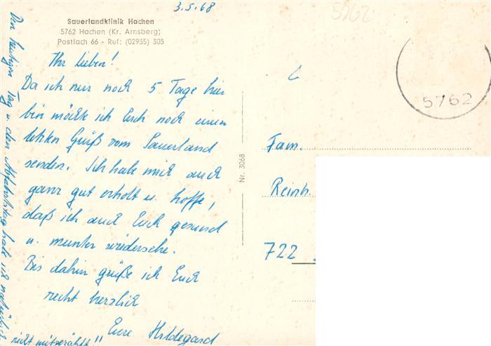 73942450 alte Postkarte Hachen Sauerland Arnsberg Sauerlandklinik Hachen postalisch gelaufen Erhaltung siehe scans [WerneD78] KatCode: 11110005958044