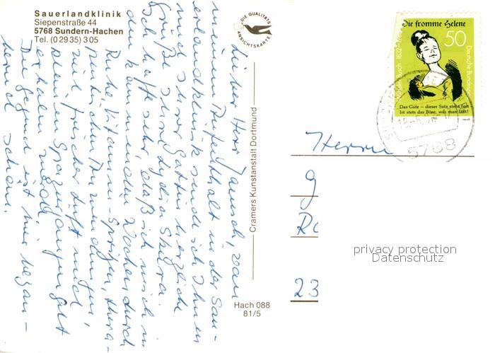 72720981 alte Postkarte Hachen Sauerland Sauerlandklinik Speisesaal Kapelle Teich postalisch gelaufen Erhaltung siehe scans [FriedD77] KatCode: 11110005958044