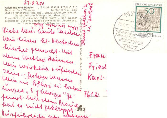 73901925 alte Postkarte Haeg-Ehrsberg Baden Gasthaus Pension zum Forsthof im Schwarzwald postalisch gelaufen Erhaltung siehe scans [FriedD77] KatCode: 11110008336106