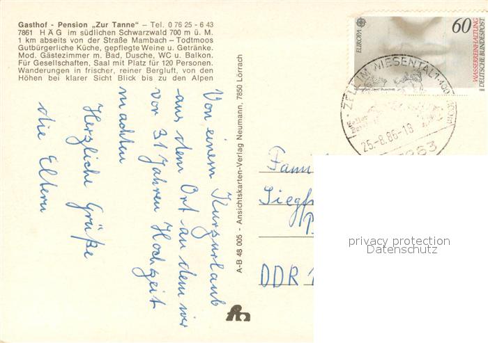 73724028 alte Postkarte Haeg-Ehrsberg Gasthof Pension Zur Tanne Panorama Gaststube postalisch gelaufen Erhaltung siehe scans [WerneD78] KatCode: 11110008336106
