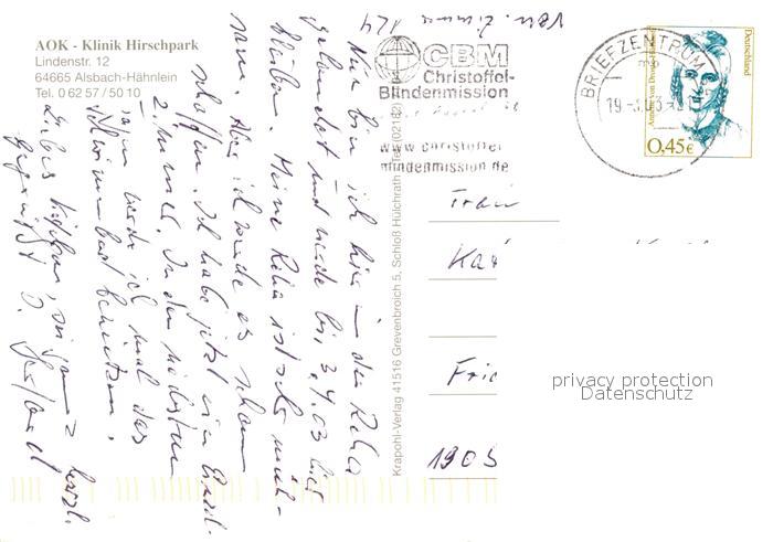 73077001 alte Postkarte Haehnlein AOK Klinik Hirschpark postalisch gelaufen Erhaltung siehe scans [KathaD81] KatCode: 11110006432001