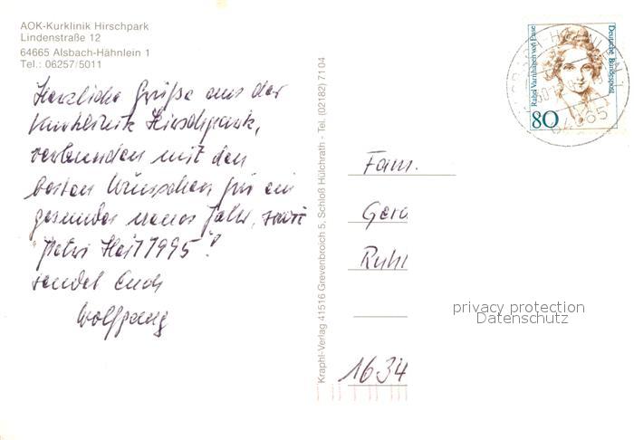 73228734 alte Postkarte Haehnlein AOK Kurklinik Hirschpark postalisch gelaufen Erhaltung siehe scans [FriedD77] KatCode: 11110006432001