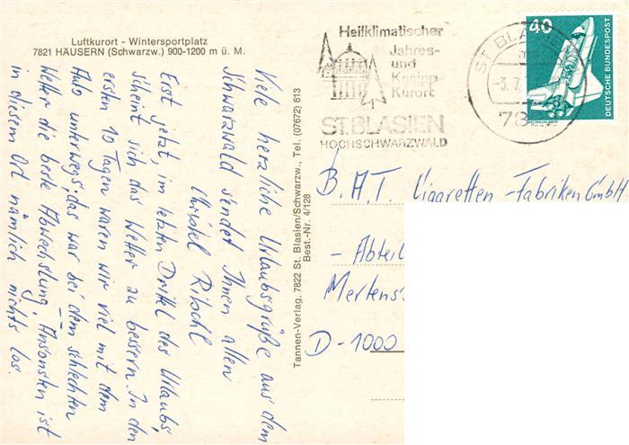 73924453 alte Postkarte Haeusern Schwarzwald Ansicht Adler mit Hallenbad Fridolinsbrunnen Beim Adler Fridolinskirche Ortsmitte Kuranlage postalisch gelaufen Erhaltung siehe scans [WerneD78] KatCode: 11110008337045