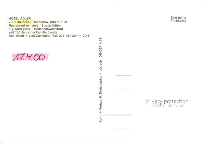73845457 Haeusern Schwarzwald Hotel Adler Restaurant postalisch nicht gelaufen Erhaltung siehe scans [FriedD77] Frie Katcode 11110008337045