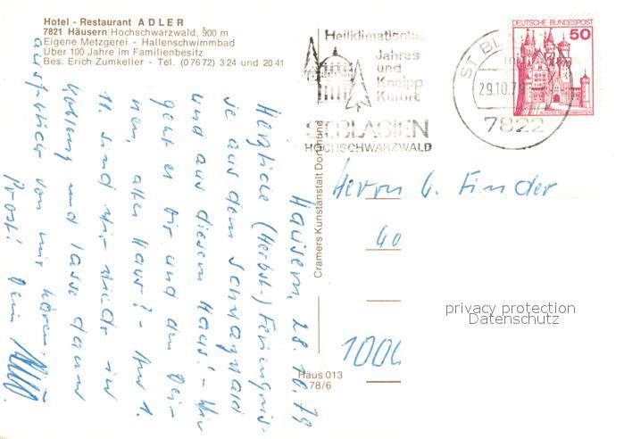 73664614 alte Postkarte Haeusern Schwarzwald Hotel Restaurant Adler postalisch gelaufen Erhaltung siehe scans [WerneD78] KatCode: 11110008337045