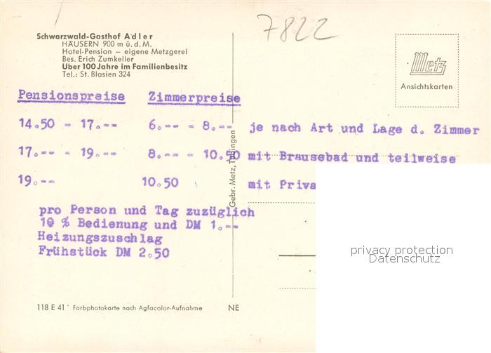 73717996 Haeusern Schwarzwald Schwarzwaldgasthof Adler postalisch nicht gelaufen Erhaltung siehe scans [WerneD78] KatCode: 11110008337045