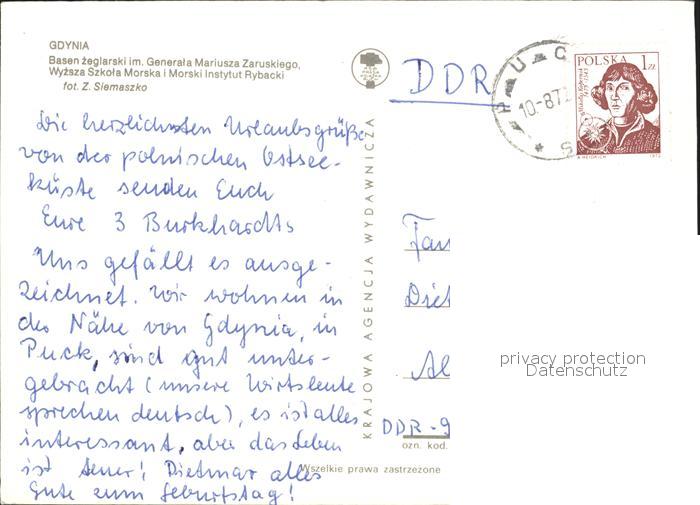 alte Postkarte Hafenanlagen Gdynia Basen zeglarski Generala Mariusza Zaruskiego Wyzsza Szkola Morska postalisch gelaufen Erhaltung siehe scans