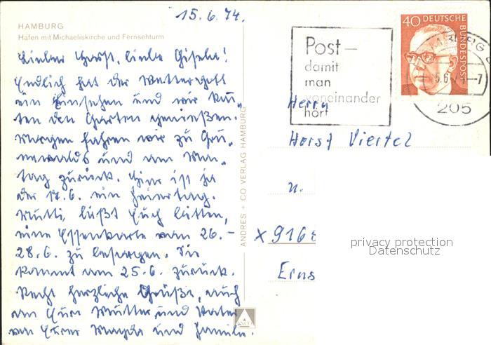 alte Postkarte Hafenanlagen Hamburg Michaeliskirche Fernsehturm postalisch gelaufen Erhaltung siehe scans