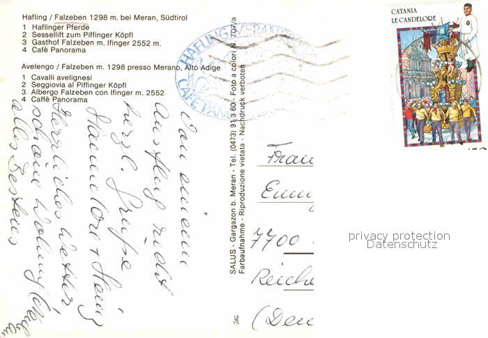 old postcard Hafling Haflinger Pferde Sessellift Piffinger Koepfl Gasthof Falzeben Ifinger Cafe Panorama Sarntaler Alpen postalisch gelaufen Erhaltung siehe scans [FriedD77]