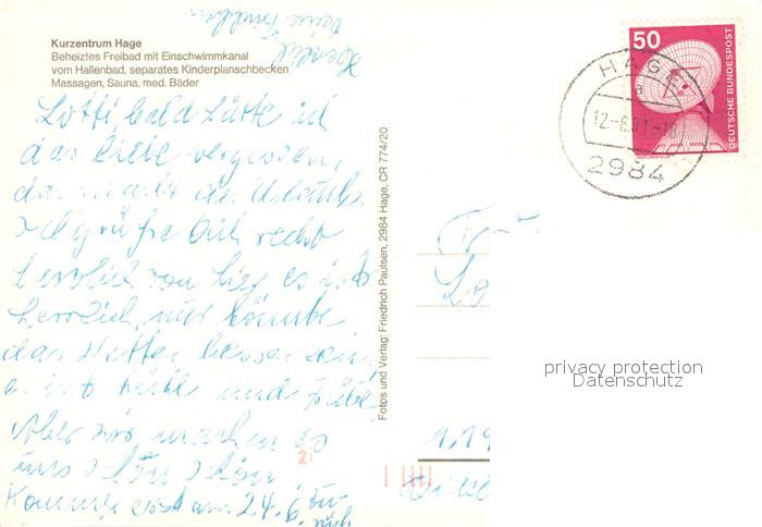73672935 alte Postkarte Hage Ostfriesland Kurzentrum Hage Freibaeder Hallenbad Kinderbecken postalisch gelaufen Erhaltung siehe scans [WerneD78] KatCode: 11110003452008