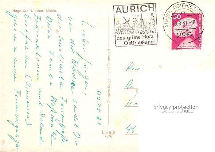 72939450 alte Postkarte Hage Ostfriesland Norden Muehle postalisch gelaufen Erhaltung siehe scans [WerneD78] KatCode: 11110003452008