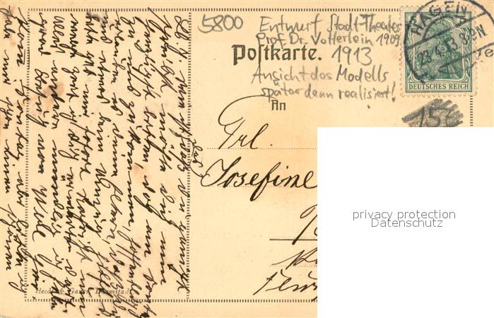 73708159 alte Postkarte Hagen Westfalen Entwurf Stadt-Theater postalisch gelaufen Erhaltung siehe scans [LiesaD40] KatCode: 11110005914000