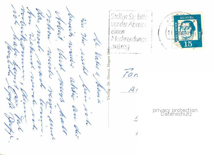72896534 alte Postkarte Hagen Westfalen Hohensyburg Parkausblick Innenstadt Stadtgarten Parkhaus Hasper Talsperre Selbecketal Hauptbahnhof postalisch gelaufen Erhaltung siehe scans [FriedD77] KatCode: 11110005914000